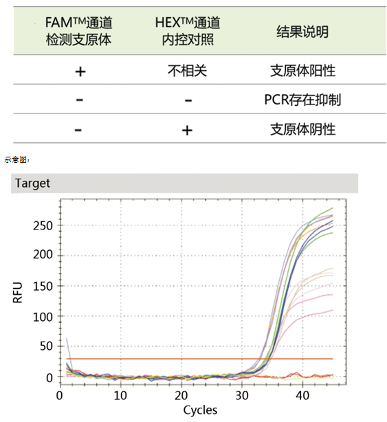 FAM通道:檢測(cè)支原體熒光信號(hào)。HEX通道:檢測(cè)內(nèi)控對(duì)照熒光信號(hào)。